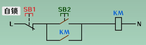1. 当上电后,按下 SB2 按钮, KM线圈得电, KM线圈得电后, 自身常开触点闭合.